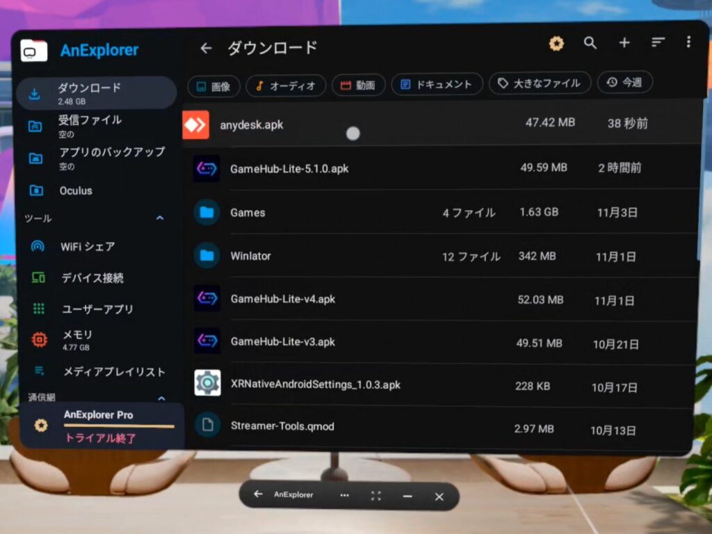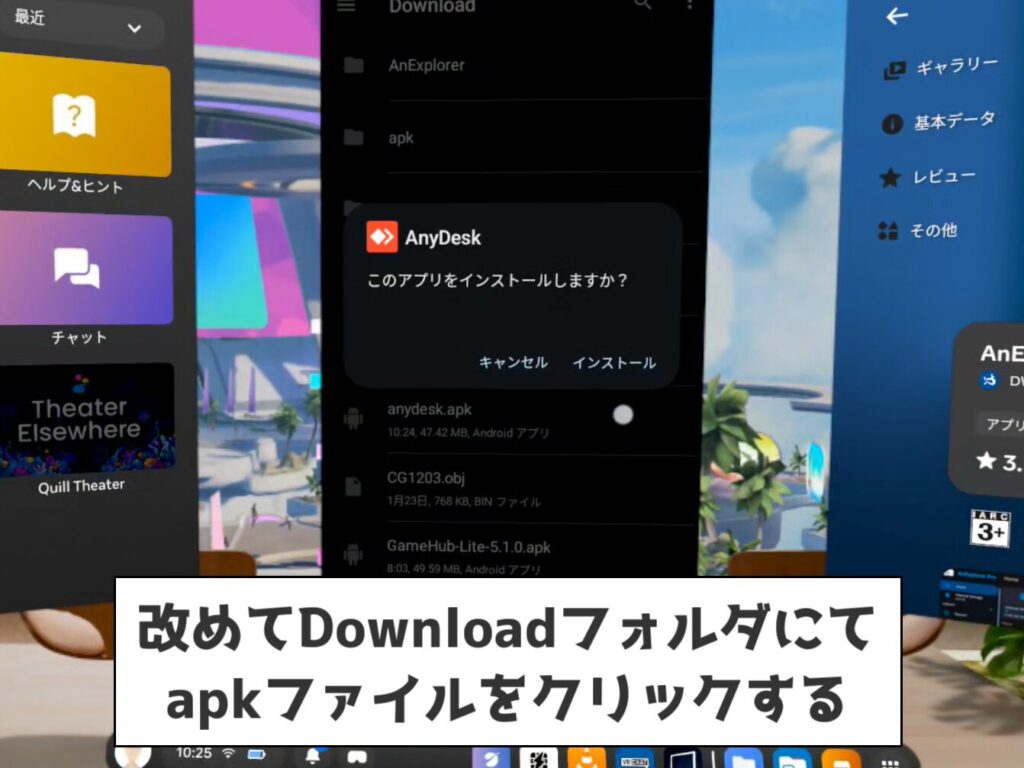 改めてAnyDeskのapkファイルをクリックすれば、AnyDeskをメタクエストにインストールできます。