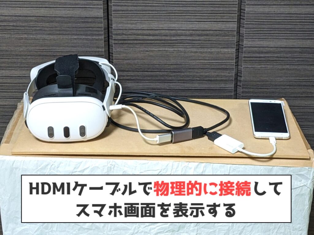 ここまで紹介してきた方法はすべて「ワイヤレス」でスマホ画面を表示する方法でしたが、HDMI LinkはスマホとメタクエストをHDMIケーブルで接続して表示します。