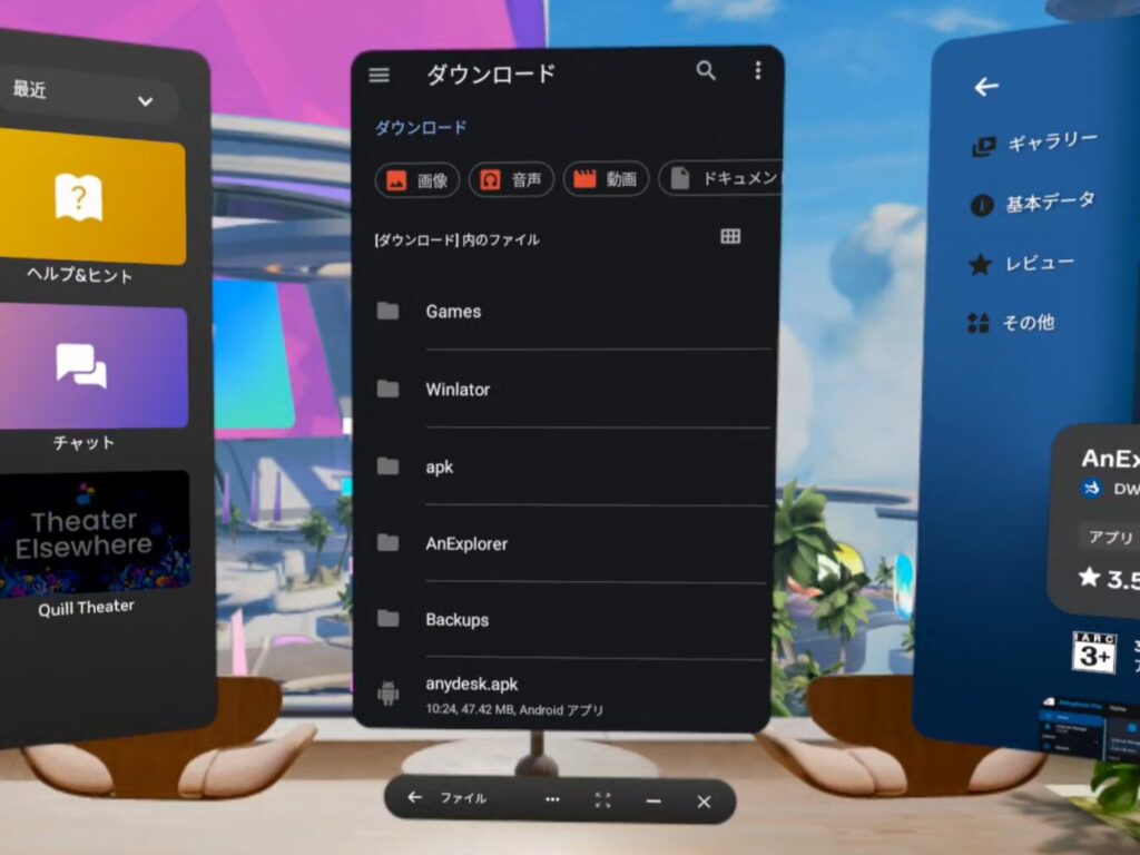 そこでQuestストアから『AnExplorer VR File Manager』をインストールして、apkファイルをインストールできるようにしましょう