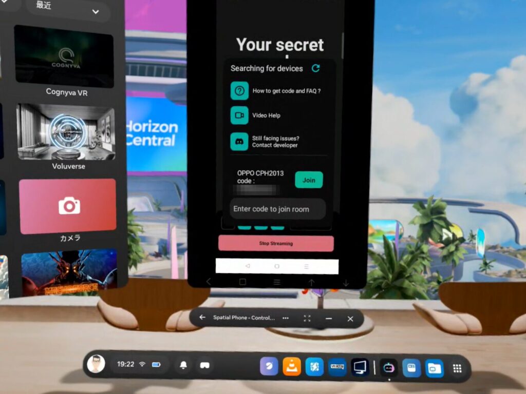「今すぐ開始」をクリックすれば、メタクエストにスマホの画面が表示されます。