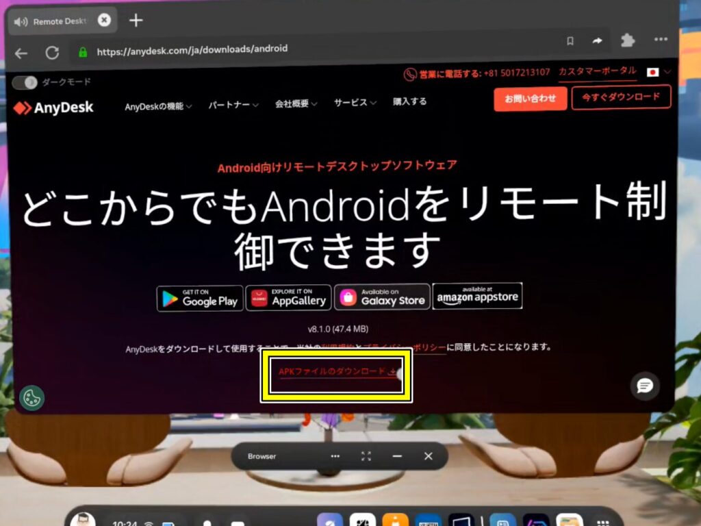 QuestストアにAnyDeskはないため、AnyDesk公式サイトからAndroid版AnyDeskのapkファイルをダウンロードし、メタクエストにインストールします。