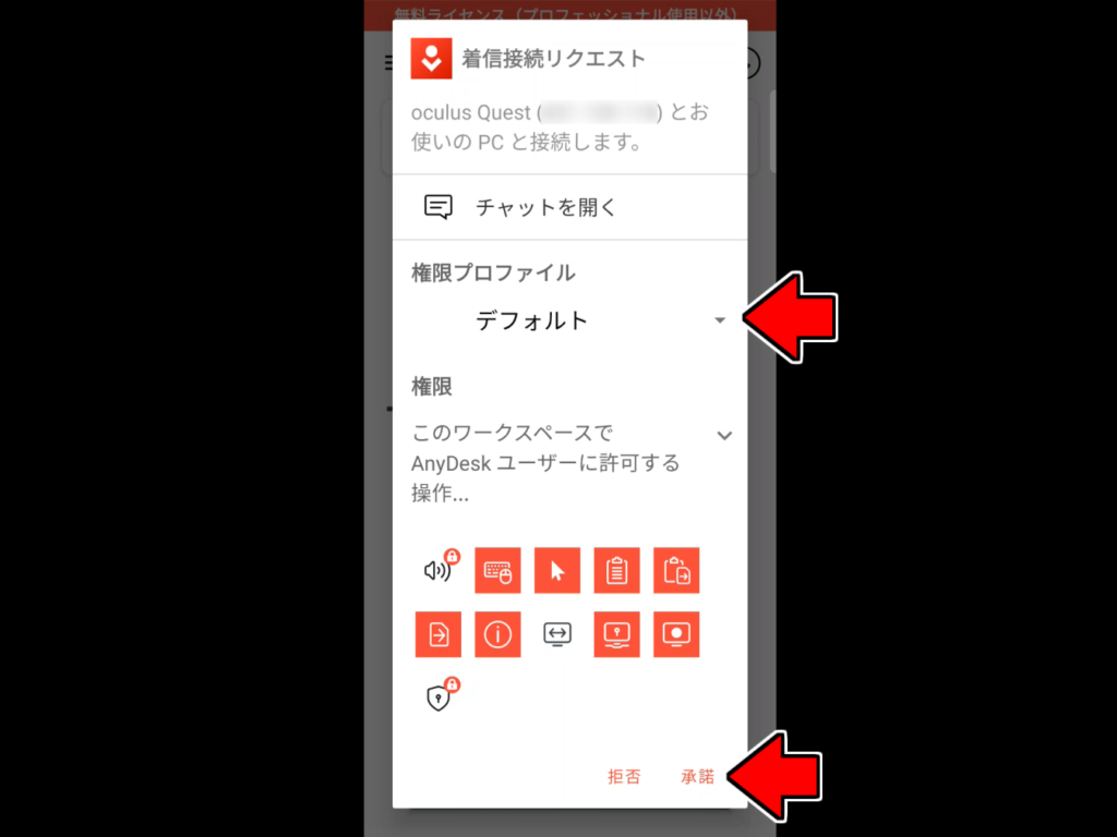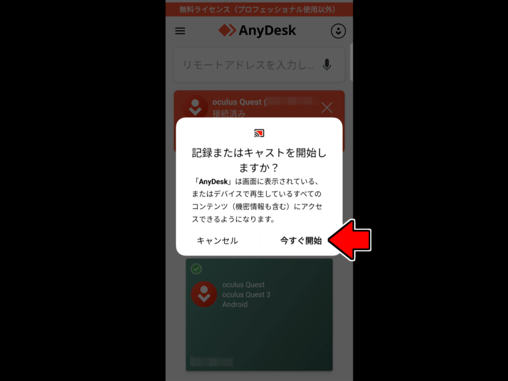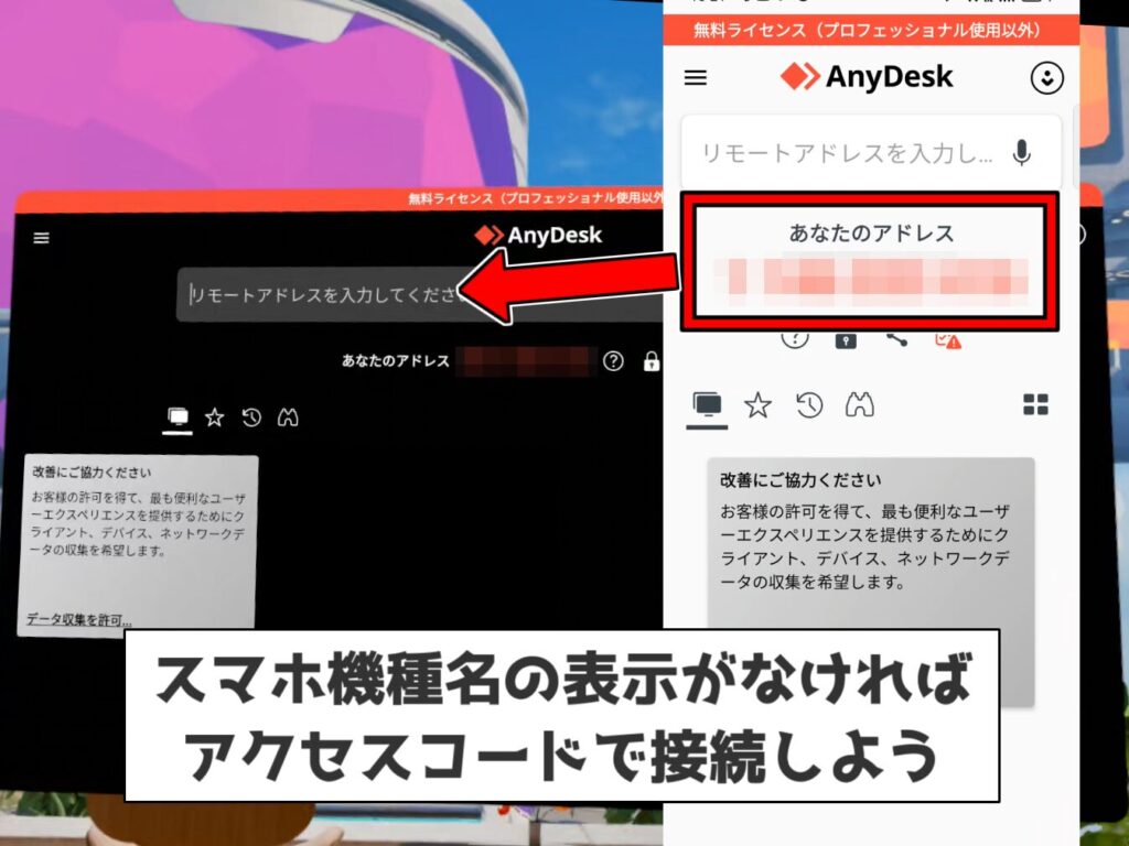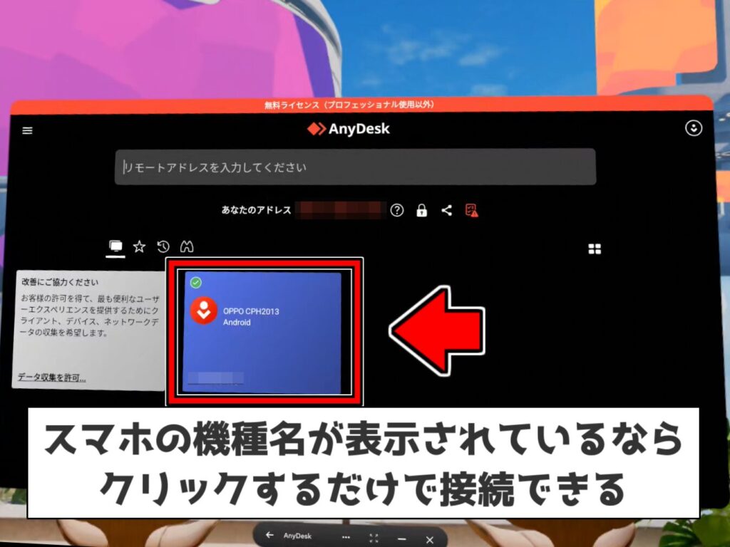 確認したリモートアドレスをメタクエスト側のAnyDeskのアクセス欄に入力して、接続アイコン(→)をクリックすれば、スマホに接続できるはずです。