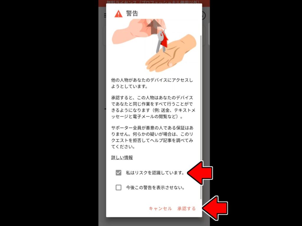 無事スマホにアクセスできれば、スマホ側に「誰かがアクセスしてきている」と警告が表示されます。