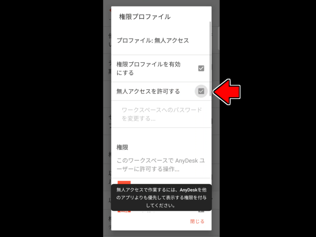 メタクエストからスマホにアクセスした際に毎回スマホ側で承諾するのが面倒な場合、スマホ側AnyDeskで「無人パスワード」を設定すれば、メタクエスト内でパスワードを入力して承諾できるようになります。