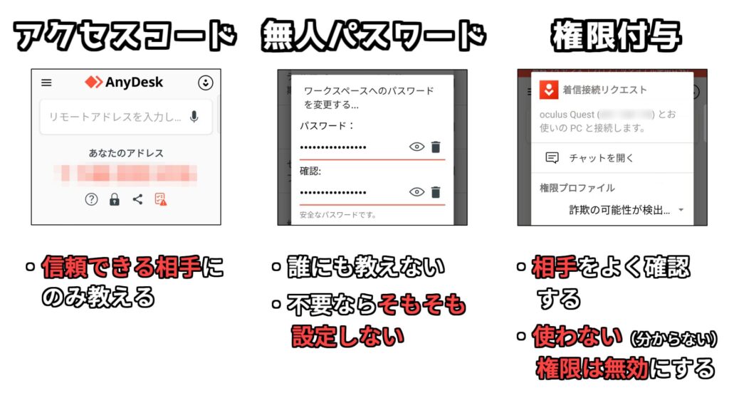 正しく使えば危険性はないアプリなので、フリーWi-Fi接続中に起動したり、アクセスコードや無人パスワードを安易に伝えたり公開しないよう気を付けましょう。