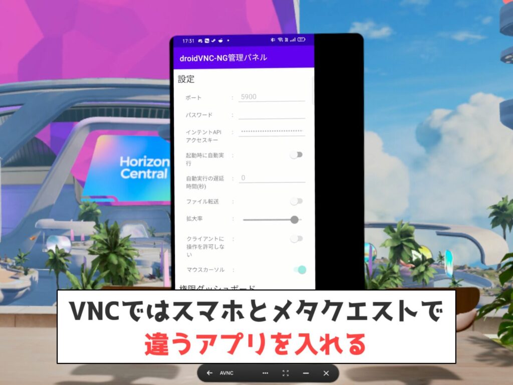 AnyDeskを使う前は、AndroidにdroidVNC-NG(サーバー)・メタクエストにAVNC(クライアント)でスマホ画面を表示していました。