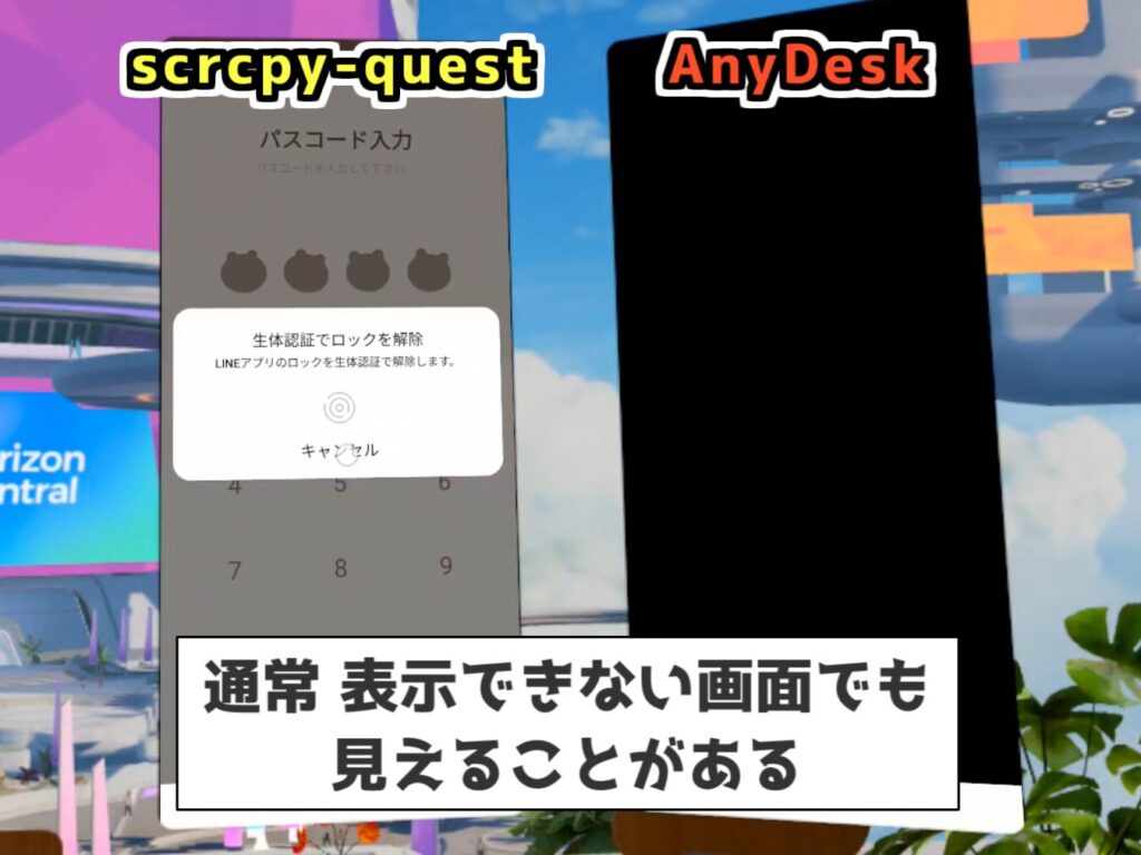 通常のキャストとは異なるため、scrcpy-questではAnyDeskなどでは表示できない、セキュリティの厳しい画面を表示できます。