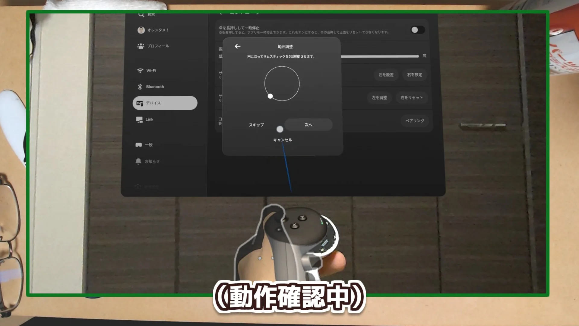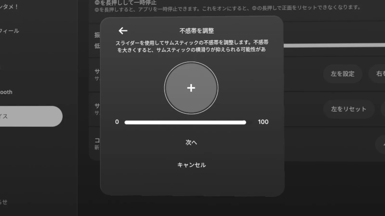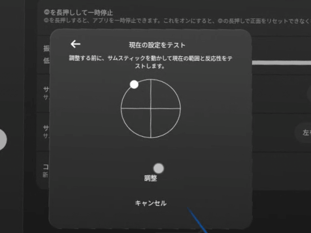 軽度なドリフトであれば、スティックをグリグリ回したり、設定から[サムスティックの範囲と不感帯]を調整したりで改善することがあります。