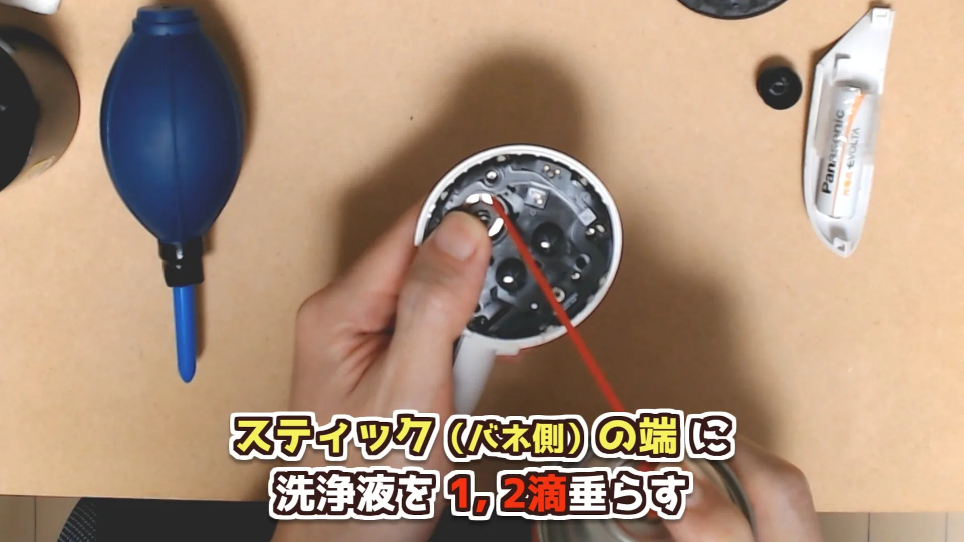 コントローラー側のバネ部分の端に、洗浄液を1〜2滴垂らします。垂らしたらスティックを左右に何周か回して、全体に行き渡らせましょう。