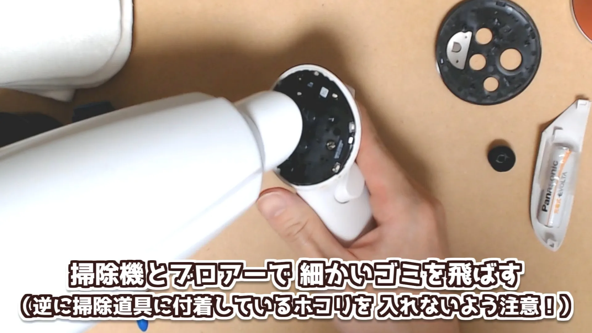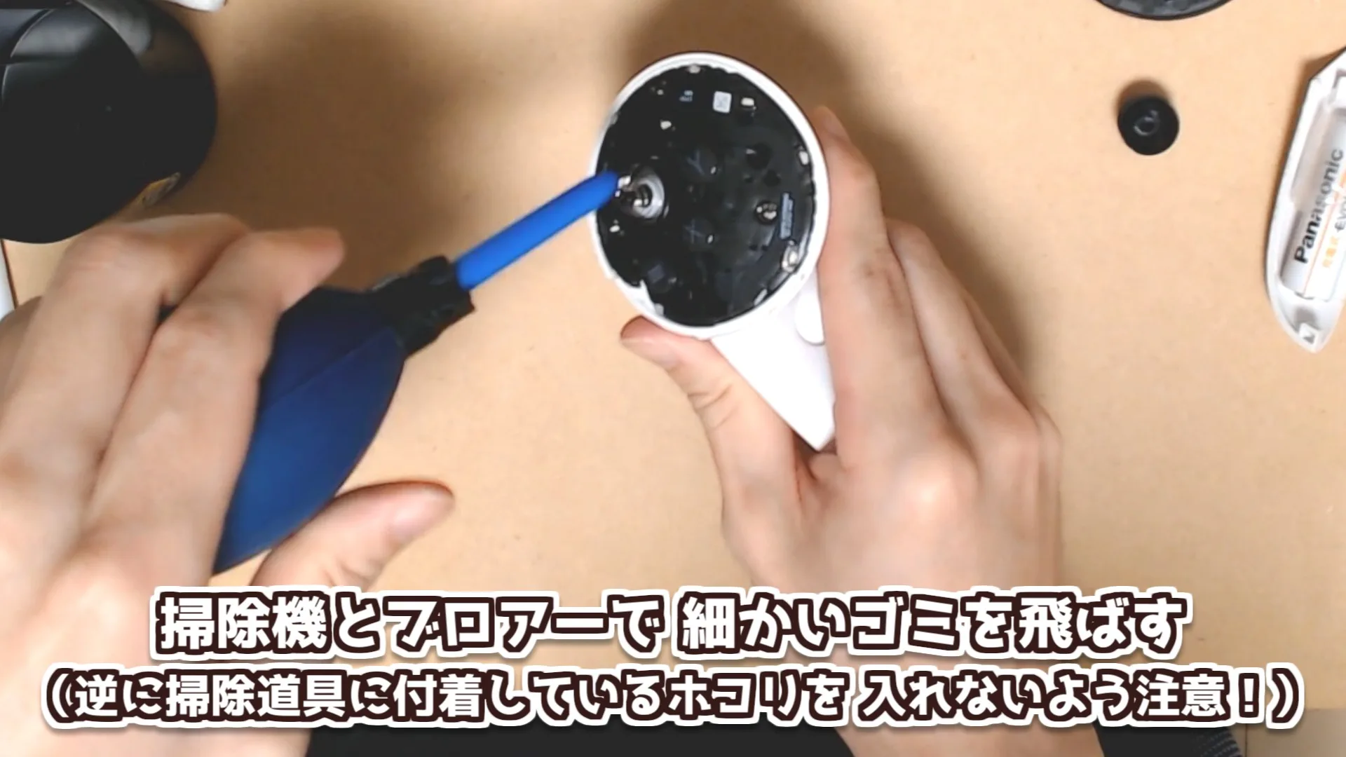 洗浄液が乾いたら、掃除機でゴミを吸ったりブロワーで細かい汚れを吹き飛ばしたりして、簡単に掃除します。