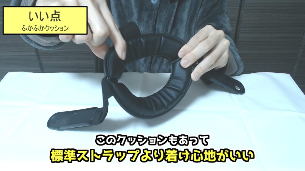 しかし先述の通り、クッションと後頭部パットのおかげで標準ストラップほどきつく締める必要はありません。