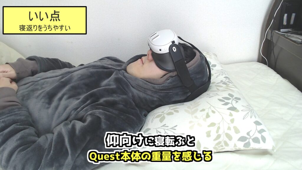 しかし代わり寝返りを打ってもメタクエスト本体がしっかり顔の前についてきてくれ、「姿勢を変えるたびにメタクエストの位置を調整する必要」は全くありませんでした。(何度も姿勢を変えると、たまに微調整は必要)