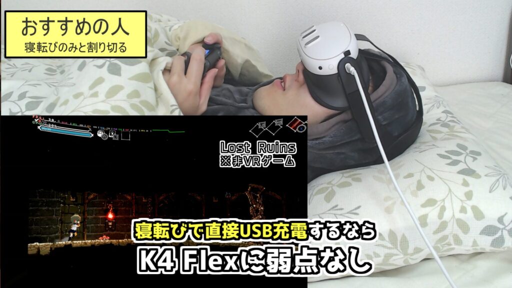 寝ころびで使うことが多いが、立ち・座りでもたまにプレイするという方は、「K4 Flex」×「P5000」のメタクエスト全力活用スタイルをぜひ試してみてください。