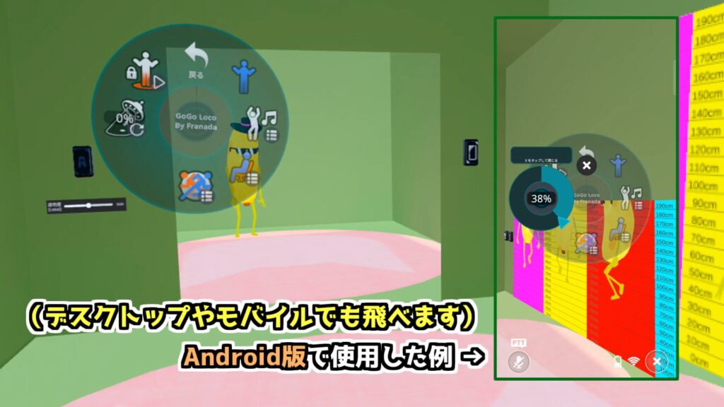 なお、次に紹介する「GoGoLoco」を代表に、一部のギミックが入っているアバターだとスティック移動やジャンプで地面に戻されることがあります。