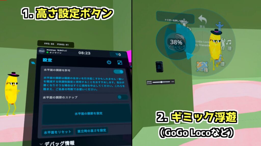 2つ目の方法は「ギミック」を使うためアバター改変が必要ですが、1つ目の方法よりもより高く浮き、高さ調整もより細かく行えます。(全デバイス対応)